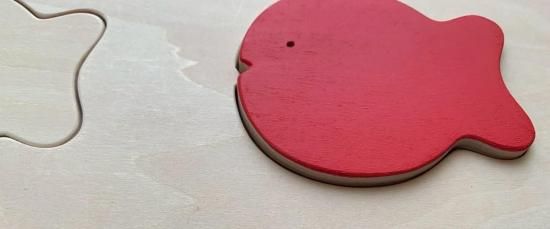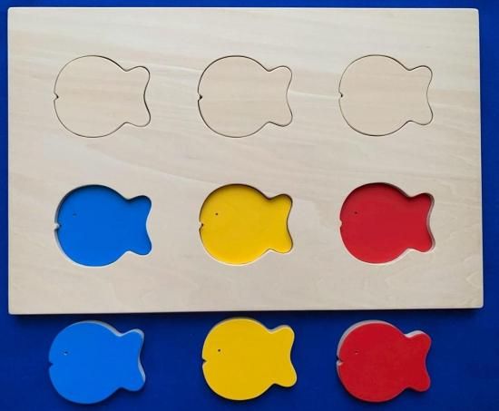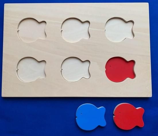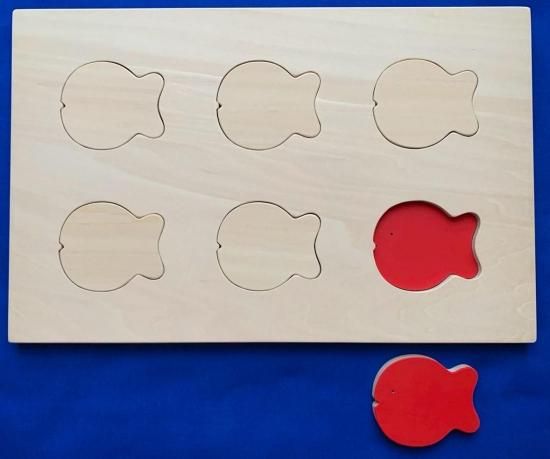 色付きの魚の裏面は無着色で呈示板(木枠)と同じですので、見本の薄い魚を呈示板から取り除き、選択肢の厚い魚だけを裏返してはめると平面となり、1色から1対1対応で学習が始められます。