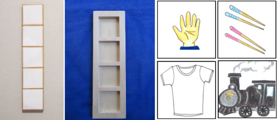 ・絵カード 手、箸、シャ ツ、汽車の4枚